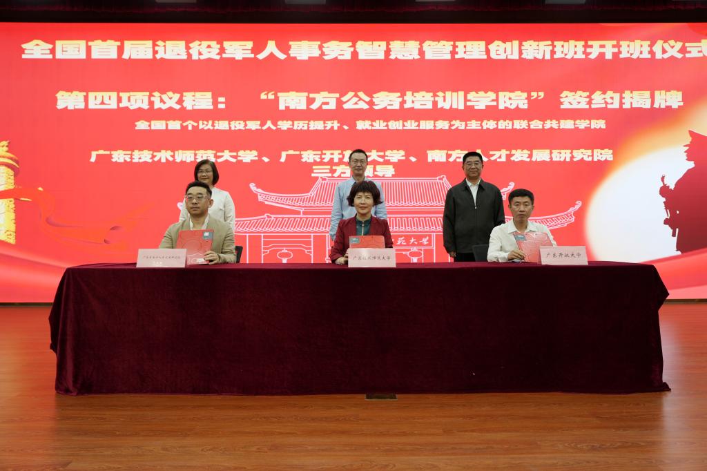 在热烈的掌声中,广东技术师范大学、广东开放大学、南方人才发展研究院三方领导共同签署合作协议,宣告全国首个聚焦退役军人学历提升与就业创业服务的“南方公务培训学院”正式成立。随后,金义富为创新班授旗,班长许佳欣同学郑重接旗,象征着新征程的开启。创新班学生代表李思远同学在发言中表达了全体学员牢记使命、勤学笃行,立志服务退役军人事业的决心。