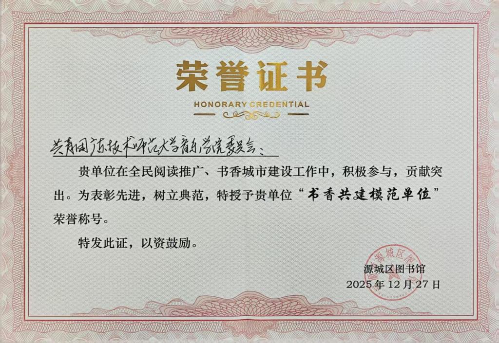 音乐学院团委获河源市源城区图书馆“书香模范共建单位”称号