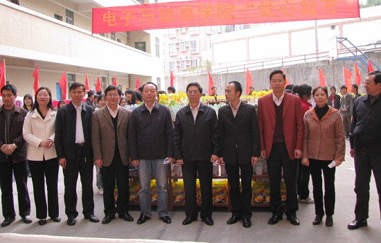 1月7日,天气寒冷,但西区学生公寓里却格外温暖。以“汇聚爱心,传递关爱”为宗旨的第四期“爱心超市”助困活动在这里隆重举行。校党委书记邝邦洪、校长王乐夫、党委副书记罗海鸥等,在党办、组织部、团委等部门负责人的陪同下,出席了本次活动,向学校全体贫困生表达了深切的关怀。邝邦洪书记赞扬电信学院党总支一直以来对贫困生的关心;希望通过“爱心超市”,把对贫困生的关爱一直持续下去;要求学校各部门进一步坚持以生为本,更好地关心学生的学习、生活,促进学生的成长、成才,尤其要关爱贫困生;勉励贫困生要自强不息、战胜困难、努力学习、健康成长。学校党政领导对广州浪奇实业股份有限公司大力支持本次“爱心超市”表示了感谢。