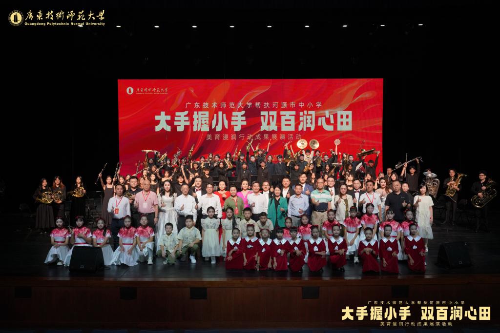 为深入贯彻教育部《全面实施学校美育浸润行动的通知》精神,积极响应广东省“双百行动”部署,集中展示校地协同推进美育工作的阶段性成果,10月31日晚,“大手握小手,双百润心田”广东技术师范大学帮扶河源市中小学美育浸润行动成果展演活动在河源桃花水母大剧院圆满举行。