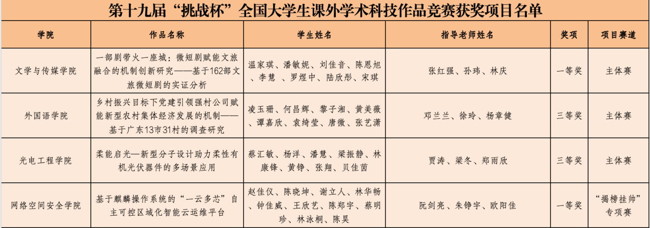 文学与传媒学院的《一部剧带火一座城:微短剧赋能文旅融合的机制创新研究——基于162部文旅微短剧的实证分析》,该项目聚焦“微短剧+文旅”融合新趋势,围绕“如何以一部剧带火一座城”这一核心问题展开系统研究,提出“政府-创作者-地方”三方协同的GCL模型,形成可复制可推广的文旅振兴模式,斩获国赛一等奖!另有两项作品获主体赛三等奖:一是外国语学院的《乡村振兴目标下党建引领强村公司赋能新型农村集体经济发展的机制——基于广东13市31村的调查研究》,探讨党建引领在强村公司推动农村集体经济高质量发展中的作用与机制;二是光电工程学院的《柔能启光—新型分子设计助力柔性有机光伏器件的多场景应用》,实现了该领域最高效率之一且对比小分子稳定性大幅提升。“揭榜挂帅”专项赛一等奖作品为网络空间与安全学院的《基于麒麟操作系统的“一云多芯”自主可控区域化智能云运维平台》,实现资产可视化盘点、远程运维协助、AI模型批量升级等功能。