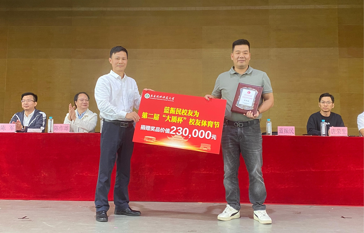 在随后的捐赠仪式上,校友们向母校表达了深情厚谊,其中:潮州校友联络处主任、1998届管理学院校友蓝振民捐赠价值23万元的“大质”凤凰单丛茶一批,2009届外语学院校友许美玲捐赠价值1.8万元的“贝琳达”不锈钢锅具一批,2013届管理学院校友蓝海龙捐赠价值1.3万元的筋膜枪一批,作为本届校友体育节的赛事奖品;2006届美术学院校友劳宏艺和校友乒乓球俱乐部分别向体育专项基金捐赠1万元,校友羽毛球俱乐部向体育专项基金捐赠6000元。