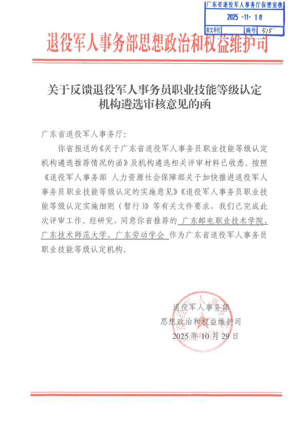 近日,退役军人事务部思想政治和权益维护司正式致函广东省退役军人事务厅,我校被确认为广东省退役军人事务员职业技能等级认定机构。
