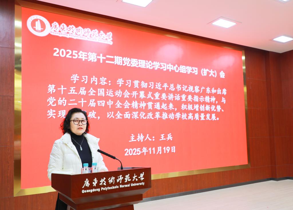 为深入学习领会习近平新时代中国特色社会主义思想的核心要义、精神实质、丰富内涵和实践要求,11月19日,学校召开2025年第十二期党委理论学习中心组学习(扩大)会,专题传达学习习近平总书记视察广东和出席第十五届全国运动会开幕式重要讲话重要指示精神,以及全省干部大会精神,研究部署学校学习宣传贯彻工作。党委书记王兵主持会议并讲话。全体校领导,党委理论学习中心组成员、全体中层干部参加学习会。