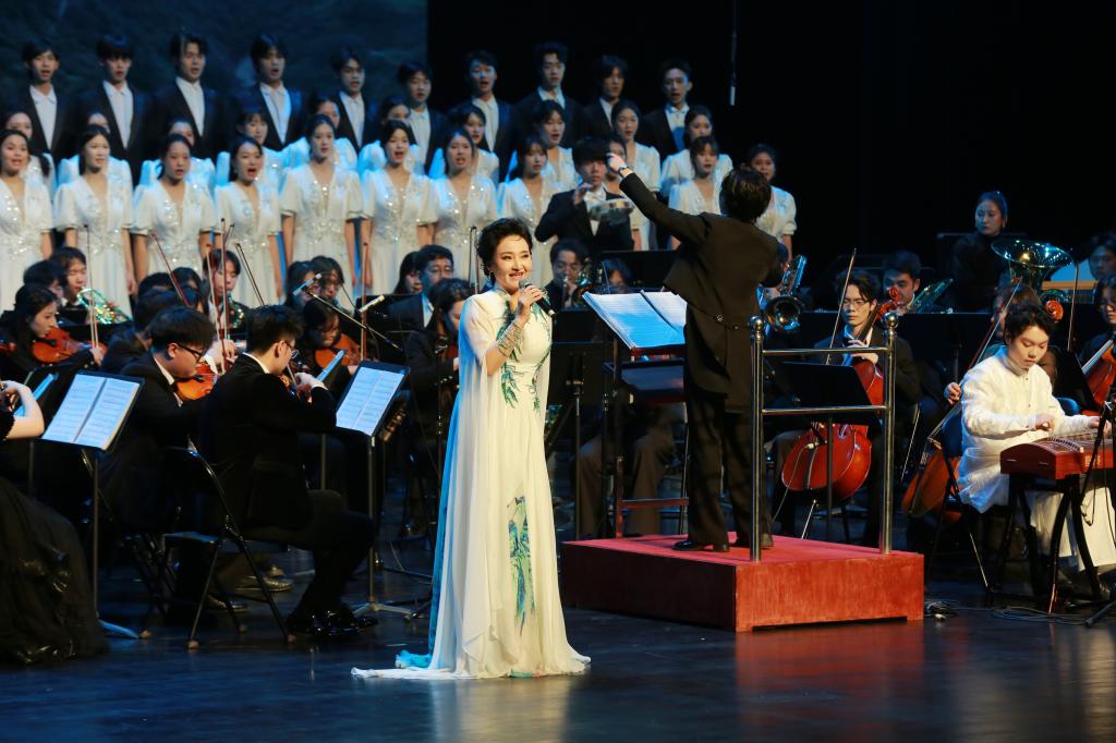 随后,音乐学院交响乐团与灯塔合唱团联袂登台,奏响经典管弦乐作品《红旗颂》。激昂雄壮的旋律与饱含深情的合唱交融共鸣,深情抒发对祖国的无限热爱与美好祝福。交响合唱《黄河》接续奏响,磅礴恢宏的乐章再现中华民族不屈不挠、奋勇拼搏的伟大精神,钢琴演奏与乐团、合唱团默契配合,精彩演绎赢得全场观众经久不息的掌声。《钢铁洪流进行曲》铿锵有力、气势昂扬,奏响新时代砥砺奋进的时代强音,让现场观众心潮澎湃。