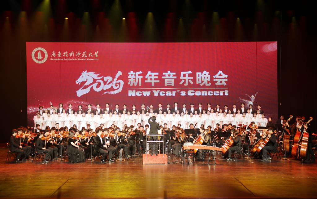 12月27日晚,广东技术师范大学2026年新年音乐晚会在河源市桃花水母大剧院举行。王兵、金义富等校领导,与省有关部门负责人、河源市领导、兄弟院校代表、社会各界嘉宾及师生代表约900人现场观看了演出。晚会同步开通线上直播,据不完全统计,线上观看人次近3万,各界人士线上线下欢聚,喜迎新年。