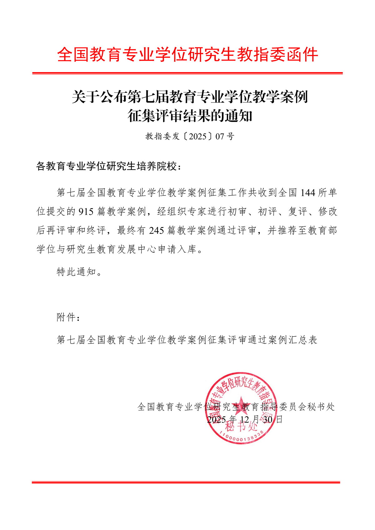 近日,全国教育专业学位研究生教育指导委员会公布了第七届教育专业学位教学案例征集工作的评审结果。本届案例征集工作吸引了全国144所单位参与,共提交915篇教学案例,经过专家初审、初评、复评、修改后再评审及终评等严格环节,最终有245篇教学案例通过评审,并被推荐至教育部学位与研究生教育发展中心申请入库,入选率仅有26.78%。我校表现优异,有6篇案例成功入选,入选率达60%,位居全国高校前列。