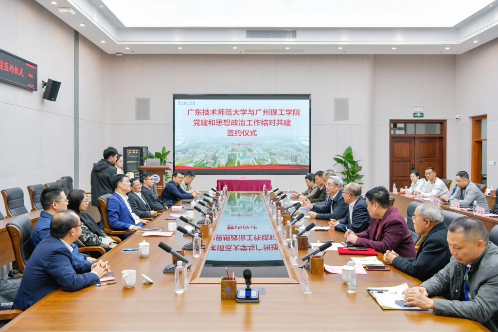 1月14日下午,我校与广州理工学院党建和思想政治工作结对共建签约仪式在广州理工学院白云校区举行。学校党委书记王兵、党委副书记杜安国,广州理工学院党委书记黄圣诚、校长胡社军、党委副书记张志红及两校相关职能部门负责人、结对共建工作组成员等参加签约仪式。会议由胡社军主持。