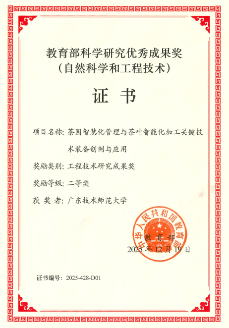 近日,教育部公布了2025年度教育部科学研究优秀成果奖(自然科学和工程技术)获奖名单。以我校为第一完成单位、我校特聘教授何勇为第一完成人的“茶园智慧化管理与茶叶智能化加工关键技术装备创制与应用”项目荣获2025年度教育部科学研究优秀成果奖工程技术研究成果奖二等奖。