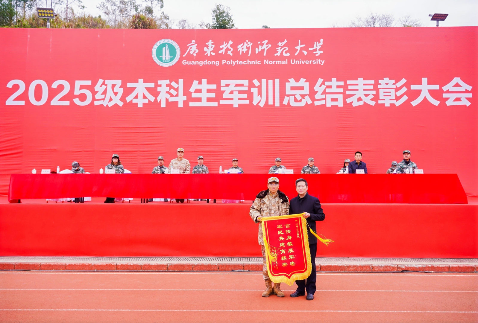 1月23日,我校在河源校区举行2025级本科生军训总结表彰大会。军训工作领导小组组长、学校党委常委、副校长苏晖,军训团团长符和超,军训团参谋长曹智,学校军训工作领导小组成员、各相关学院党委书记、副书记及全体参训师生参加大会。