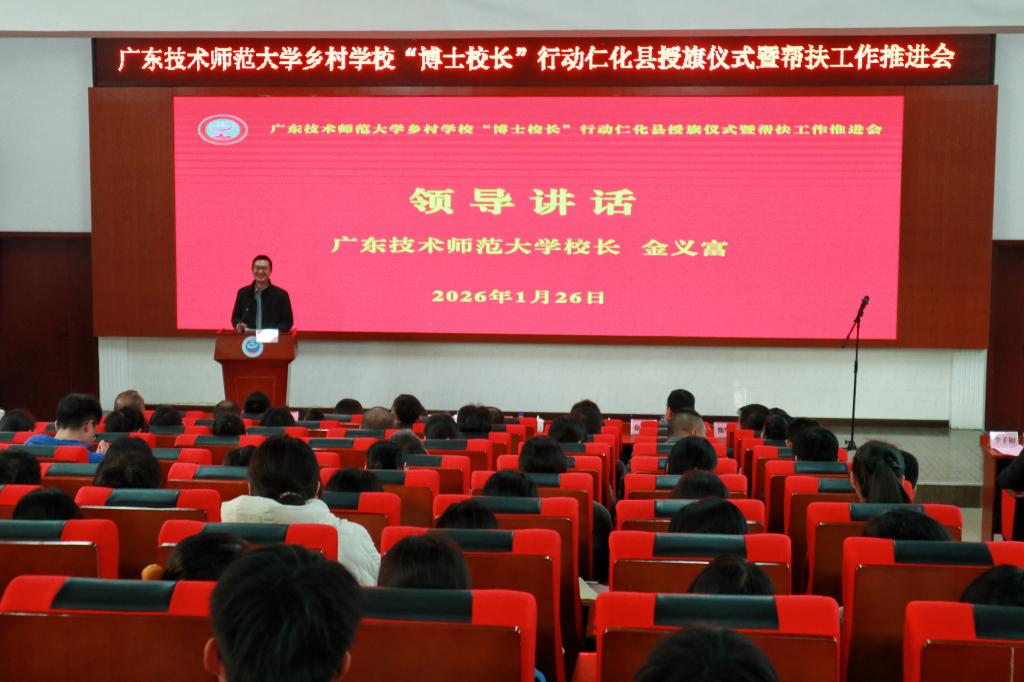为贯彻落实《广东省教育厅关于广东省师范(教师教育)院校纵向帮扶欠发达地区“三所学校”和县中质量提升工作方案(2024—2027年)》精神,深入推进“双百行动”走深走实,1月26日下午,广东技术师范大学在韶关市仁化县举行乡村学校“博士校长”行动仁化县授旗仪式暨帮扶工作推进会。学校校长金义富率队出席活动,学校相关职能部门负责人、“博士校长”代表以及驻周田镇帮镇扶村工作队、驻仁化县“双百行动”服务队成员参加会议。韶关市和仁化县有关领导陪同调研。