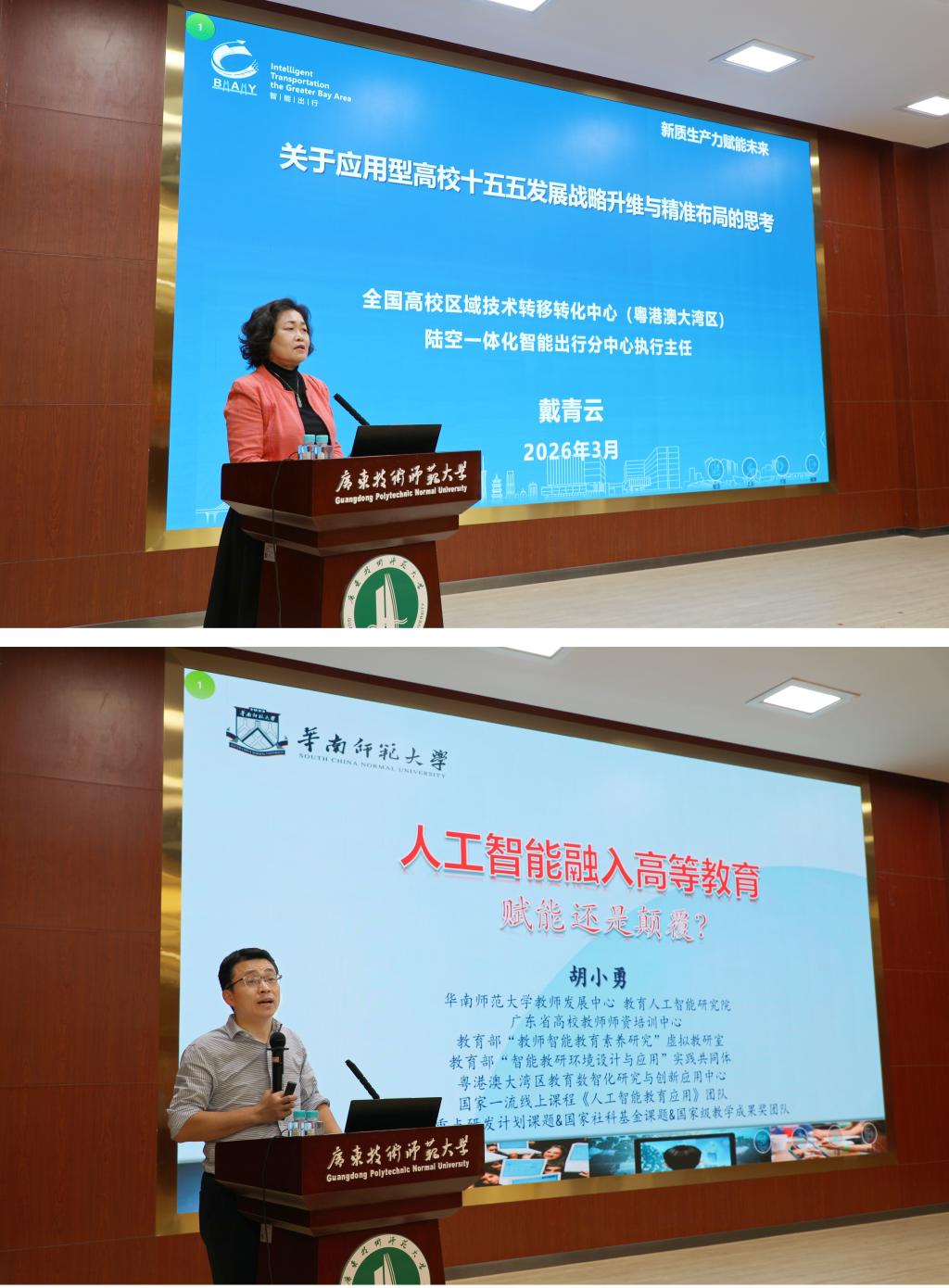 专题辅导报告环节紧扣发展前沿。全国高校陆空一体化智能出行区域技术转移转化中心执行主任戴青云作《关于应用型高校“十五五”发展战略升维与精准布局的思考》专题报告,为学校战略规划提供了宏观视野;华南师范大学教师发展中心主任、教育人工智能研究院常务副院长胡小勇作《人工智能融入高等教育赋能还是颠覆?》专题报告,深入探讨了技术变革与教育创新的深层关系。
