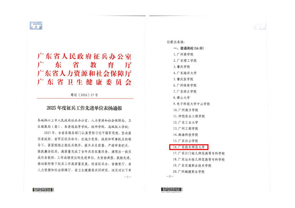 近日,广东省人民政府征兵办公室、广东省教育厅、广东省人力资源和社会保障厅、广东省卫生健康委员会等相关部门对2025年度全省征兵工作先进单位进行了通报表彰。我校凭借扎实的征兵工作基础和突出的成效,荣获“广东省征兵工作先进单位”荣誉称号,是全省获此殊荣的8所公办本科高校之一。这是我校继2018年获此荣誉后,时隔七年再次摘得该项殊荣。