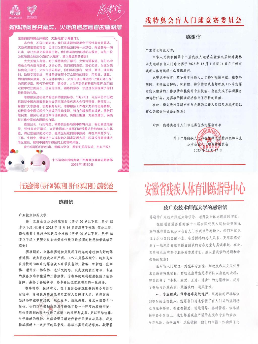 近日,第十五届全国运动会(以下简称“十五运会”)和全国第十二届残疾人运动会暨第九届特殊奥林匹克运动会(以下简称“残特奥会”)广东省执委会、残特奥会开幕式组委会、排球竞委会、盲人门球竞委会及安徽省残疾人体育训练指导中心等5家单位分别向我校发来感谢信。信中对我校6名带队教师及423名“小海豚”志愿者在赛会期间的优异表现表示衷心感谢,对我校以高度的责任感与使命感,高质量完成所承担的赛会志愿服务各项任务,为赛会圆满成功举办做出的积极贡献给予高度肯定。