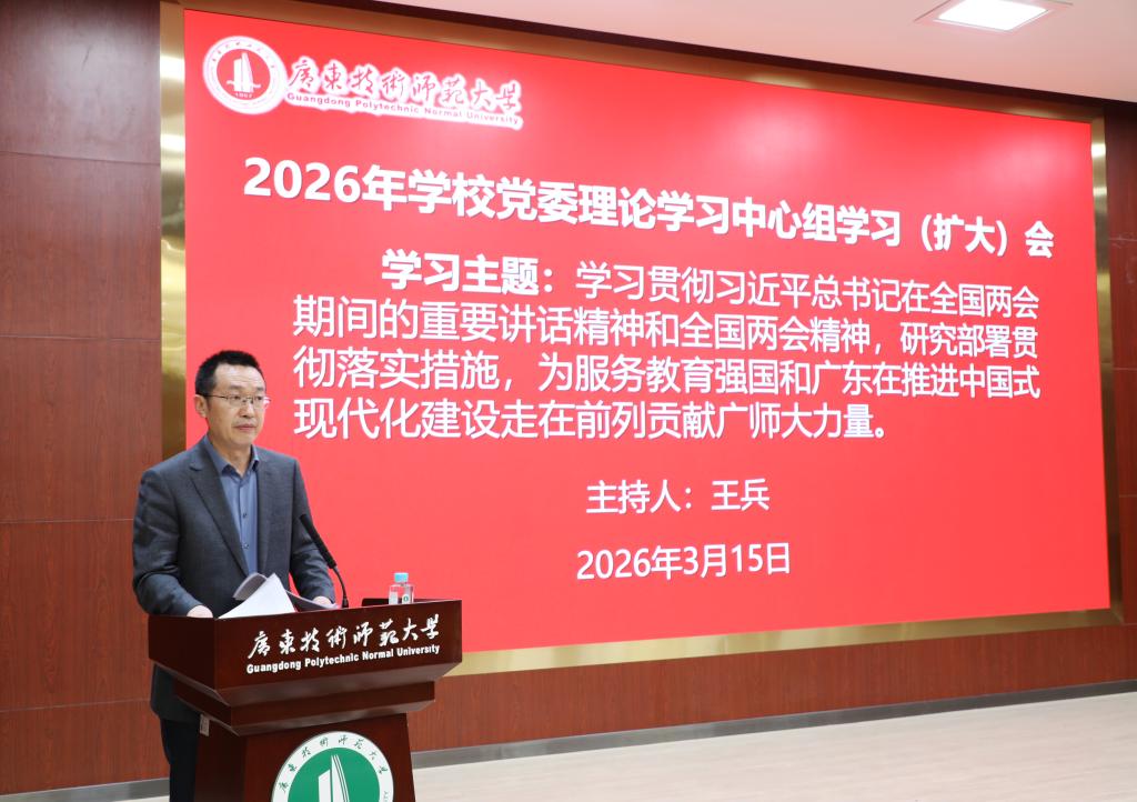 为学习贯彻习近平总书记在全国两会期间的重要讲话精神和全国两会精神,3月15日,学校召开党委理论学习中心组第二期学习(扩大)会,研究部署贯彻落实措施,为服务教育强国和广东在推进中国式现代化建设中走在前列贡献广师大力量。党委书记王兵主持会议并讲话。全体校领导、全体中层干部参加会议。