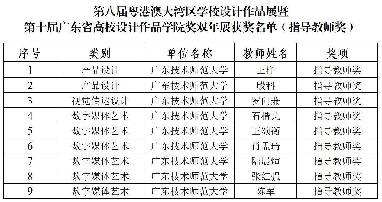 近日,第八届粤港澳大湾区学校设计作品展暨第十届广东省高校设计作品学院奖双年展评选结果揭晓。我校师生在此次展览中表现优异,共斩获41个奖项。其中,教师组荣获一等奖2项、二等奖1项、三等奖3项;学生组荣获一等奖2项、二等奖7项、三等奖17项;9位教师荣获指导教师奖,充分展现了我校师生扎实的专业素养与过硬的综合能力。
