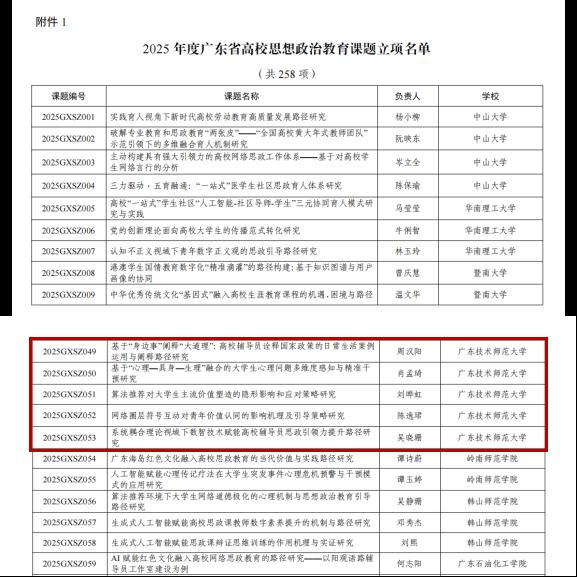 近日,广东省教育厅公布了2025年度广东省高校思想政治教育课题立项名单。学校推荐的5项课题全部成功获批立项,立项数量位居省内同类高校前列,充分彰显我校辅导员队伍扎实的专业素养和良好的科研能力。