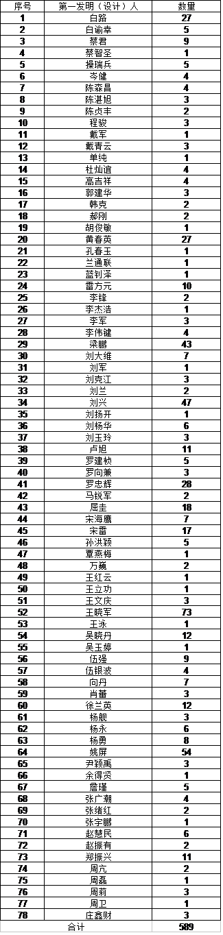 科研处依据《科研管理系统》中的知识产权数据审核了我院2016年发明专利申请数,并对每个发明人申请的数量进行了汇总统计,请各相关单位通知各发明人核对数量是否准确。