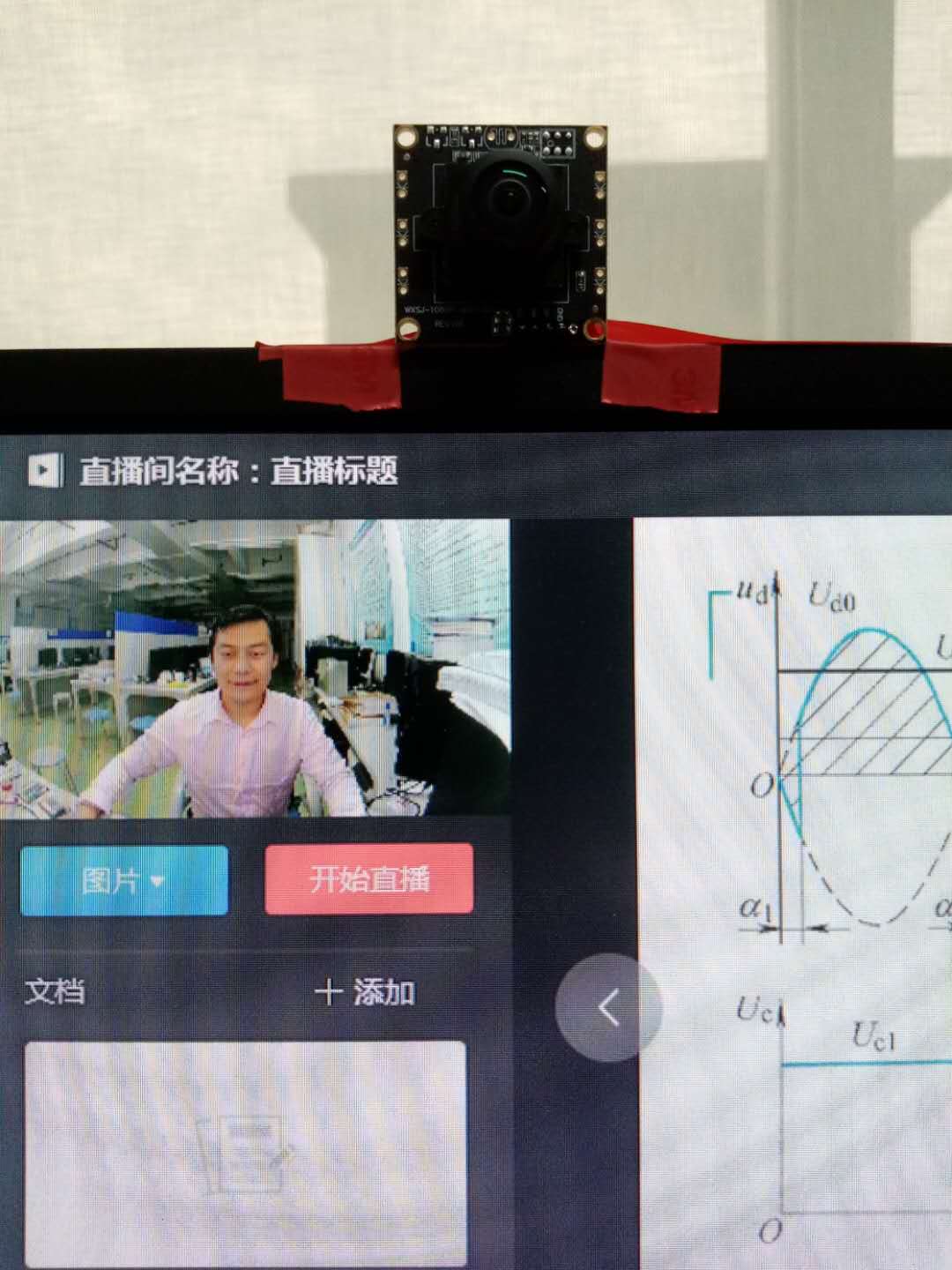 视频传输对网络带宽要求较高,因此摄像头不是必须的。但网络良好情况下使用摄像头可提高课堂氛围和交互性,建议酌情选配。摄像头无特殊要求,一般使用普通USB摄像头即可。笔者手头刚好有工业监控用的摄像头,通过胶带简单固定到电脑显示器上即可,效果如图2所示。