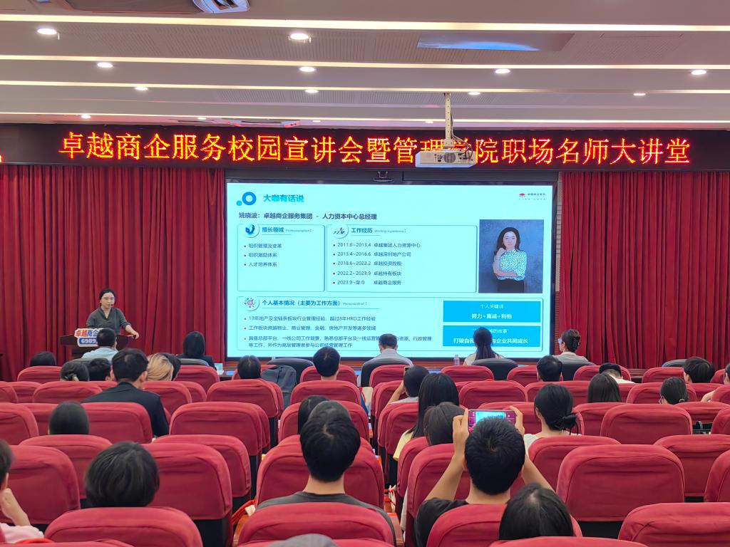 随后在白云校区三教104报告厅举办校园招聘宣讲会暨管理学院名师大讲堂活动,管理学院2025届校友黄蔚俊、郑海蓝,在校学生代表参加。主讲人向同学们全面展示了企业的组织架构、发展历程及企业成果,并对招聘岗位的职责与要求进行了详细的介绍。在“大咖面对面”环节,杨志东和姚晓波与学生亲切交流,耐心解答关于行业趋势、职业选择与能力塑造等方面的疑问,现场气氛热烈。此外,姚晓波围绕简历优化、面试技巧与职业规划等关键环节,结合多年招聘经验实例讲解,为同学们提供了实用高效的求职指导;入职卓越商企服务的校友黄蔚俊分享了自己的求职心路与经验,为学弟学妹提供了宝贵参考。