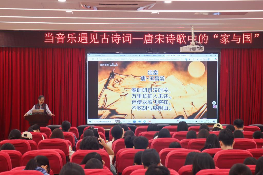 10月22日下午,由教务处(美育中心)主办的美育名师大讲堂在白云校区三教104讲学厅顺利举行。本次讲座特邀音乐学院苏玲芬教授担任主讲,以《当音乐遇见古诗词——唐宋诗歌中的“家与国”》为主题,为现场师生带来一场融汇文学、历史与音乐的精彩分享,带领300余名师生在诗词与音乐的交融中,感悟唐宋时期家的温情与国的大义。