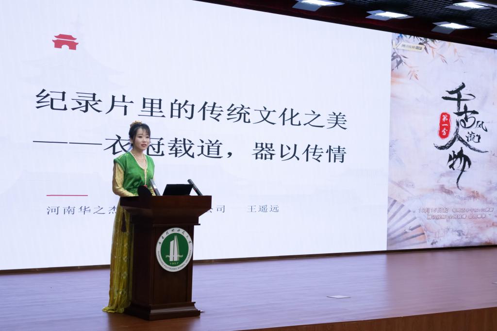 王遥远导演以大型历史文化纪录片《千古风流人物》的创作历程为主线,带领现场师生走进纪录片创作的幕后世界。她以专业的视角生动阐释了“服装、化妆、道具”如何超越其物质属性,成为承载历史的“视觉语言”。通过片中经典人物案例的深入剖析,层层揭示了服饰、器物背后深厚的文化内涵与丰富的情感承载,让在场师生深刻感受到传统文化在光影艺术中的生动再现。