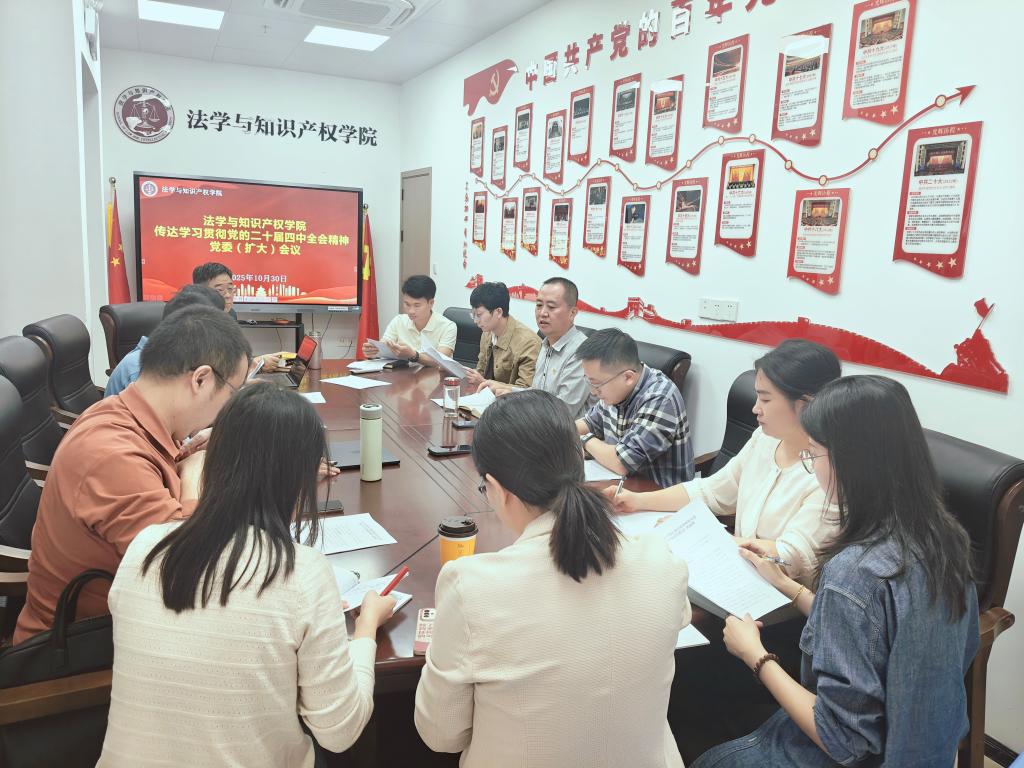 10月30日,法学与知识产权学院召开党委(扩大)会议,专题传达学习习近平总书记在党的二十届四中全会上的重要讲话和全会精神。学院全体党委委员、党支部书记、系主任、专业负责人和政工干部参加会议。