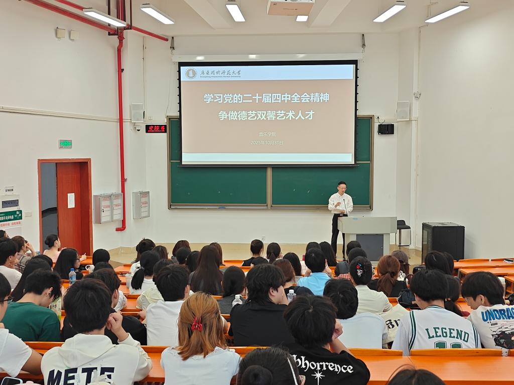 10月31日,为深入学习贯彻党的二十届四中全会精神,音乐学院党委书记黄锡炳、副书记赵璐在河源校区开展了专题学习教育,黄锡炳作《学习党的二十届四中全会精神,争做德艺双馨艺术人才》的专题宣讲,音乐学院师生代表参加学习。