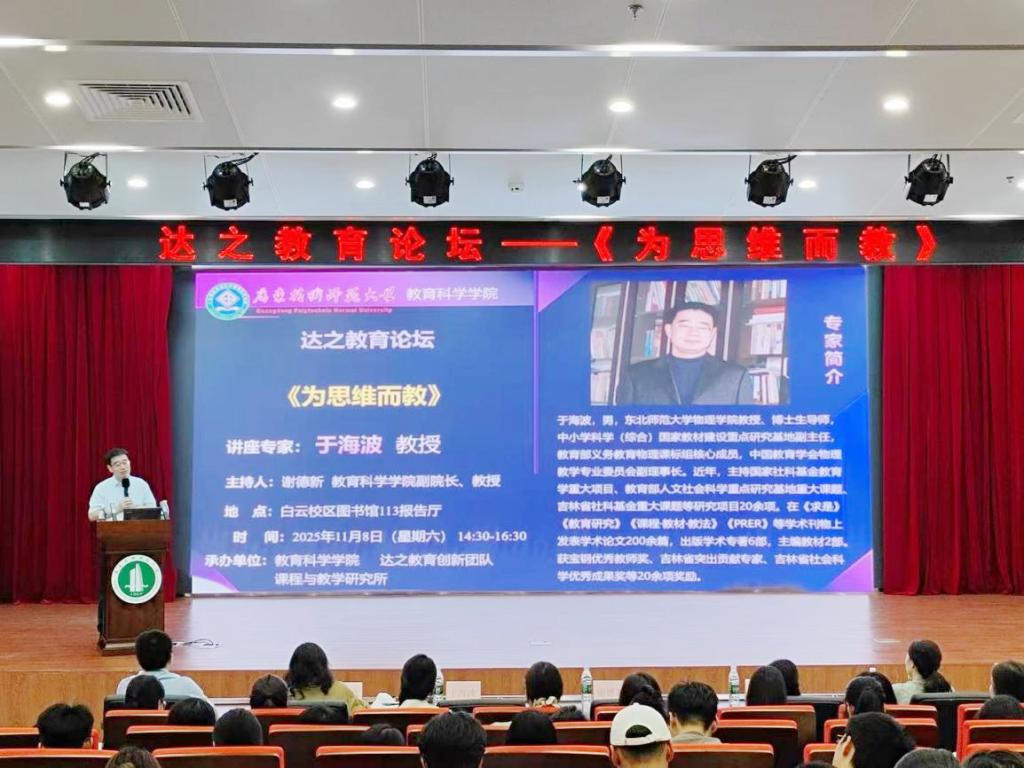 11月8日下午,东北师范大学物理学院教授、博士生导师于海波应邀在广东技术师范大学白云校区图书馆113报告厅作题为“为思维而教”的专题讲座。本次讲座由教育科学学院副院长谢德新教授主持,共有320名师生到现场聆听讲座。