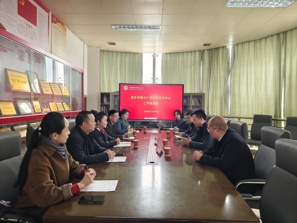 11月20日,广州人民艺术中心负责人曹春晖一行来音乐学院洽谈交流。音乐学院党委书记黄锡炳、院长刘春红、副院长邓昆、副院长陈菊芬及相关人员出席交流活动。