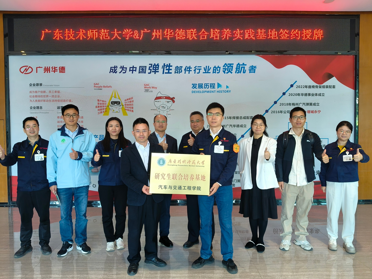 为深化产教融合,推动专业建设与人才培养提质增效,12月18日,学校研究生院院长陈泳竹、汽车与交通工程学院党委副书记邝绮琳、副院长曾祥坤、黄永现博士、李洪硌博士及联合培养研究生代表一行7人赴广州华德汽车弹簧有限公司,举行研究生联合培养实践基地签约暨授牌仪式。广州华德汽车弹簧有限公司党总支书记贺晓恒、总经理张俊、副总经理邓小云及有关部门主管出席会议。