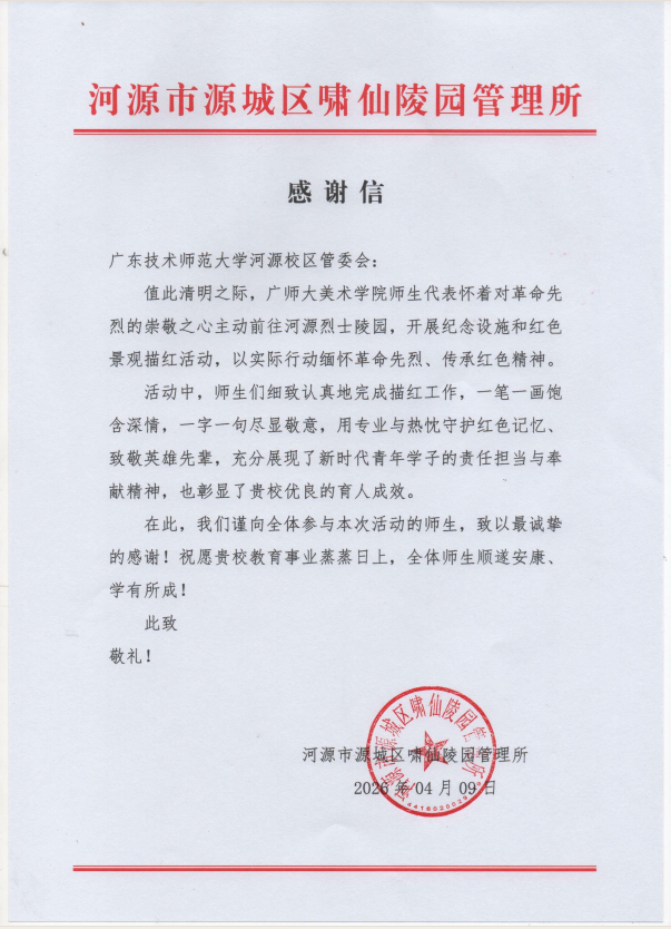 近日,河源市源城区啸仙陵园管理所向我校河源校区管委会发来感谢信,对校区师生代表前往河源烈士陵园开展纪念设施与红色景观描红活动,致以诚挚感谢与高度赞扬。