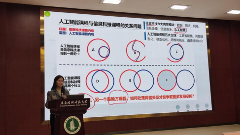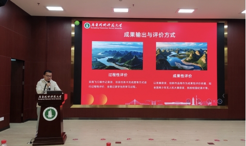 我校教育科学学院张晓梅老师进一步阐释了“基于无人机的人工智能通识课”的设计逻辑与课程体系。她结合广东省中小学人工智能课程指导纲要,分析了无人机课程如何承载系统思维、编程实践、跨学科融合与真实问题解决等教育目标。课程体系涵盖通识基础、飞行原理、手动操控、编程控制与成果产出等模块,力求在乡村学校实现从“教知识”到“育素养”的深层次教学重构。