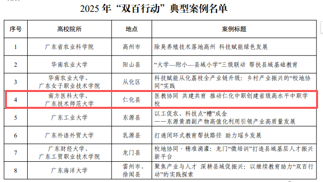 近日,广东省“百千万工程”指挥部“双百行动”专班办公室公布了2025年“双百行动”优秀典型案例和典型案例名单。由我校联合南方医科大学申报的《医教协同、共建共育:高校共同推动仁化中职创建省级高水平中职学校》成功入选2025年“双百行动”典型案例。本次典型案例评选由省“百千万工程”指挥部“双百行动”专班统一组织实施,经过高校申报、材料审核、专家评选等环节,围绕实效性、创新性和可复制性进行综合评估,最终在全...