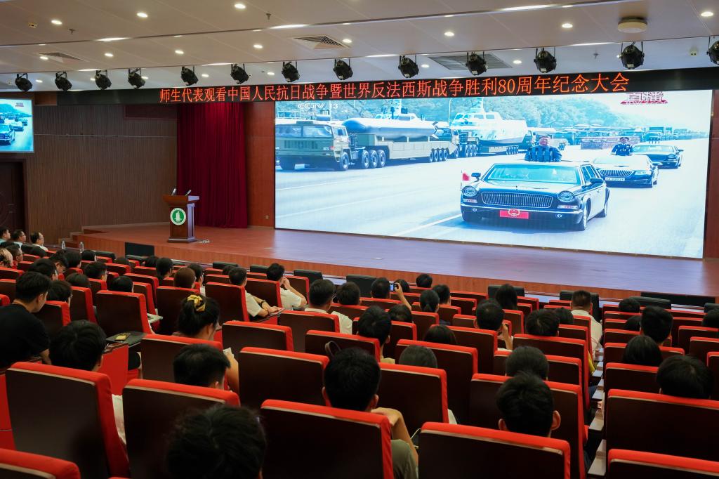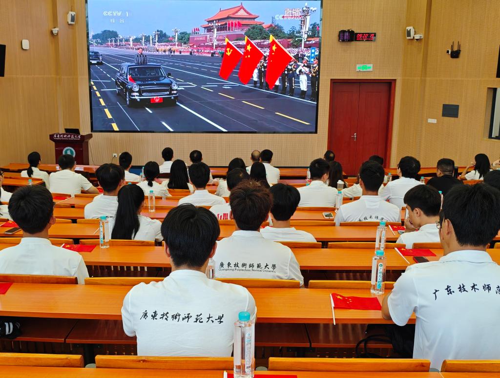 9月3日,纪念中国人民抗日战争暨世界反法西斯战争胜利80周年大会在北京隆重举行,中共中央总书记、国家主席、中央军委主席习近平发表重要讲话并检阅部队。学校组织师生集中收听收看大会直播,并在东校区工业中心801设置主会场,白云校区、河源校区设置分会场,近1000名师生代表集中现场观看,共同见证这一庄严时刻。