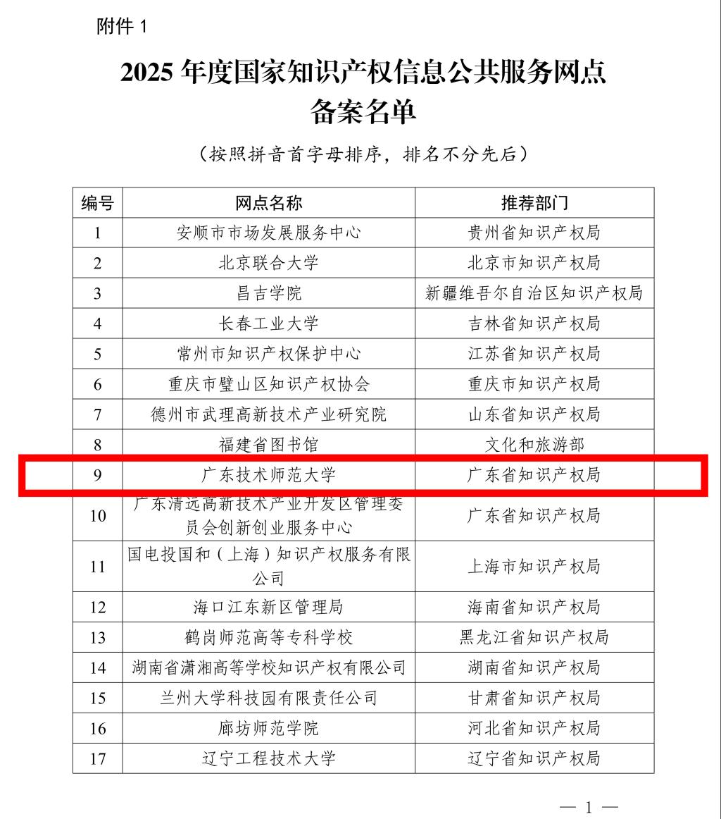 10月13日,国家知识产权局公布“2025年度国家知识产权信息公共服务网点备案名单”,我校经广东省知识产权局推荐,通过审批、公示等环节,成功入选,成为广东省第四家国家知识产权信息公共服务网点备案高校。标志我校知识产权工作正式纳入国家知识产权公共服务体系,为学校高质量发展和区域创新体系建设注入新动能。