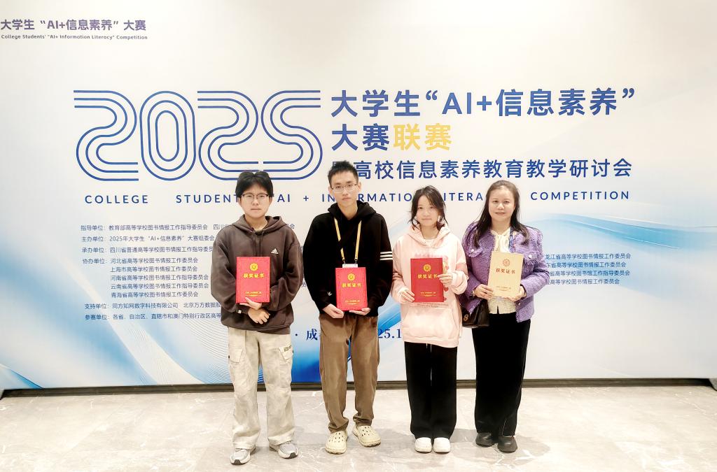 11月27日,2025年大学生“AI+信息素养”大赛在成都圆满落幕。由我校计算机科学学院罗一帆、数据科学与工程学院余培跃、教育科学学院蓝丹婧组成的团队,凭借出色表现在全国联赛本科生赛道中荣获三等奖。图书馆覃燕梅、罗阳老师荣获“优秀指导教师”奖。