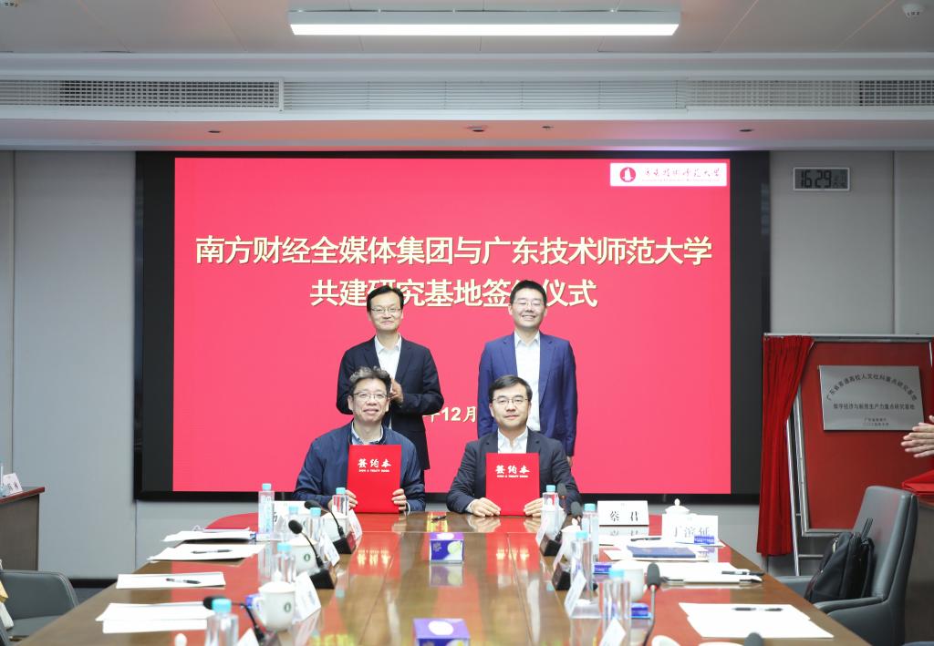 会上,南方财经全媒体集团与广东技术师范大学签署了共建基地合作协议。胡智勇在致辞中强调了该研究基地在学科交叉与产学研融合方面的重要意义,并表示集团将围绕“数字技术创新与普惠金融”研究方向,与学校开展实质性合作,持续推动科技创新与产业创新协同发展。