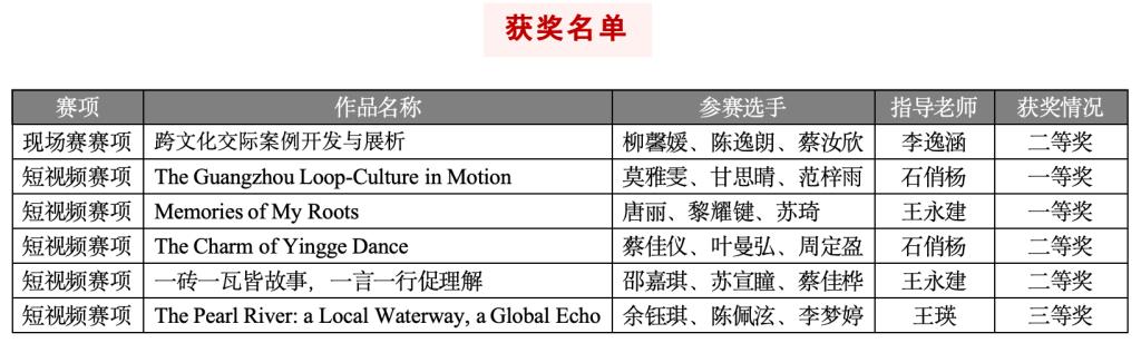 近日,由广东省本科高校外语类专业教学指导委员会与上海外语教育出版社联合主办、广东工商职业技术大学承办、广东省本科高校大学英语课程教学指导委员会协办的第八届“外教社杯”全国高校学生跨文化能力大赛广东赛区公布比赛结果。我校学子以出色的表现,获得跨文化能力大赛赛项省赛二等奖1项,“讲述中国 传播中国”短视频赛项省赛一等奖2项、二等奖2项及三等奖1项。