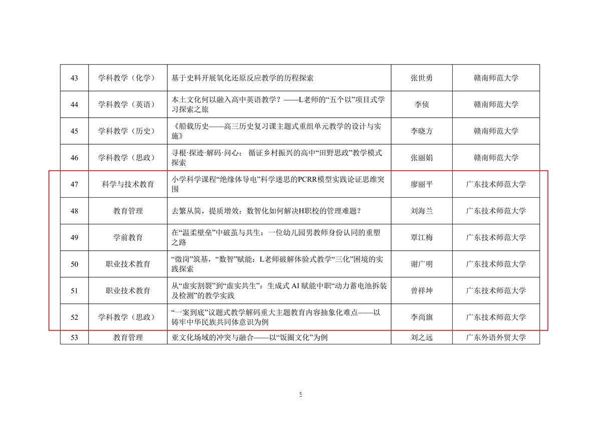 我校廖丽平教授主持撰写的《小学科学课程“绝缘体导电”科学迷思的PCRR模型实践论证思维突围》、刘海兰教授主持撰写的《去繁从简,提质增效:数智化如何解决H职校的管理难题?》、覃江梅副教授主持撰写的《在“温柔壁垒”中破茧与共生:一位幼儿园男教师身份认同的重塑之路》、谢广明教授主持撰写的《“微岗”筑基,“数智”赋能:L老师破解体验式教学“三化”困境的实践探索》、曾祥坤副教授主持撰写的《从“虚实割裂”到“虚实共生”:生成式 AI 赋能中职“动力蓄电池拆装及检测”的教学实践》、李尚旗教授主持撰写的《“一案到底”议题式教学解码重大主题教育内容抽象化难点——以铸牢中华民族共同体意识为例》等6篇教学案例成功入选专业学位教学案例中心案例库。截至目前,我校入库的教育硕士教学案例已达15篇,其中职业技术教育(装备制造)5篇、学前教育3篇、教育管理2篇、学科教学(语文)1篇、学科教学(音乐)1篇、学科教学(思政)1篇、职业技术教育(交通运输)1篇、科学技术与教育1篇。
