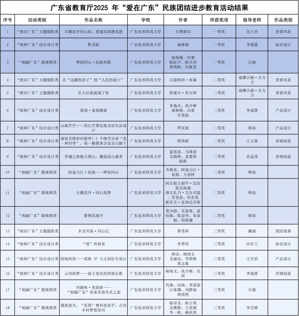 近日,广东省教育厅公布了2025年“爱在广东”学校民族团结进步教育活动评选结果。我校在本届活动中成绩斐然,荣获“优秀组织奖”,遴选报送的作品共斩获三等奖以上18项,其中包括一等奖3项、二等奖9项、三等奖6项。