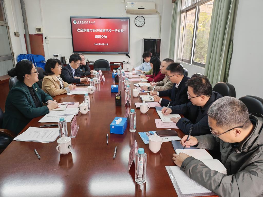1月13日,东莞市经济贸易学校党委副书记、校长黎辅明一行来校,就“3+4”中职本科贯通培养试点合作进行了专题调研交流。学校副校长许玲出席座谈会,教务处、网络空间安全学院等相关单位负责人参加了会议。