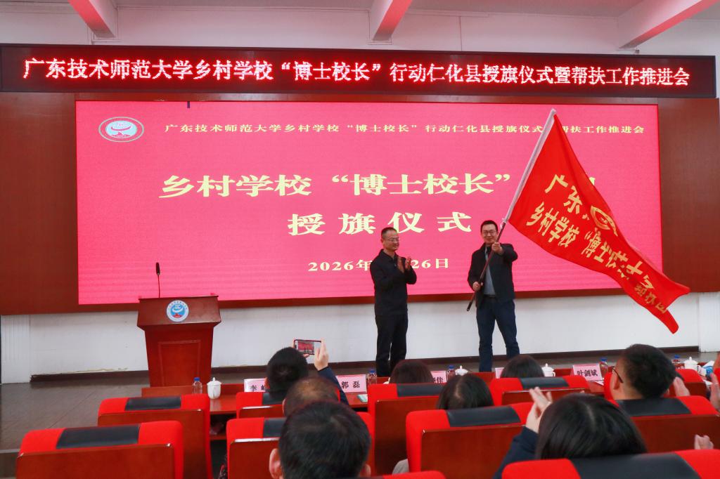 为贯彻落实《广东省教育厅关于广东省师范(教师教育)院校纵向帮扶欠发达地区“三所学校”和县中质量提升工作方案(2024—2027年)》精神,深入推进“双百行动”走深走实,1月26日下午,广东技术师范大学在韶关市仁化县举行乡村学校“博士校长”行动仁化县授旗仪式暨帮扶工作推进会。学校校长金义富率队出席活动,学校相关职能部门负责人、“博士校长”代表以及驻周田镇帮镇扶村工作队、驻仁化县“双百行动”服务队成员参加会议。韶关市和仁化县有关领导陪同调研。