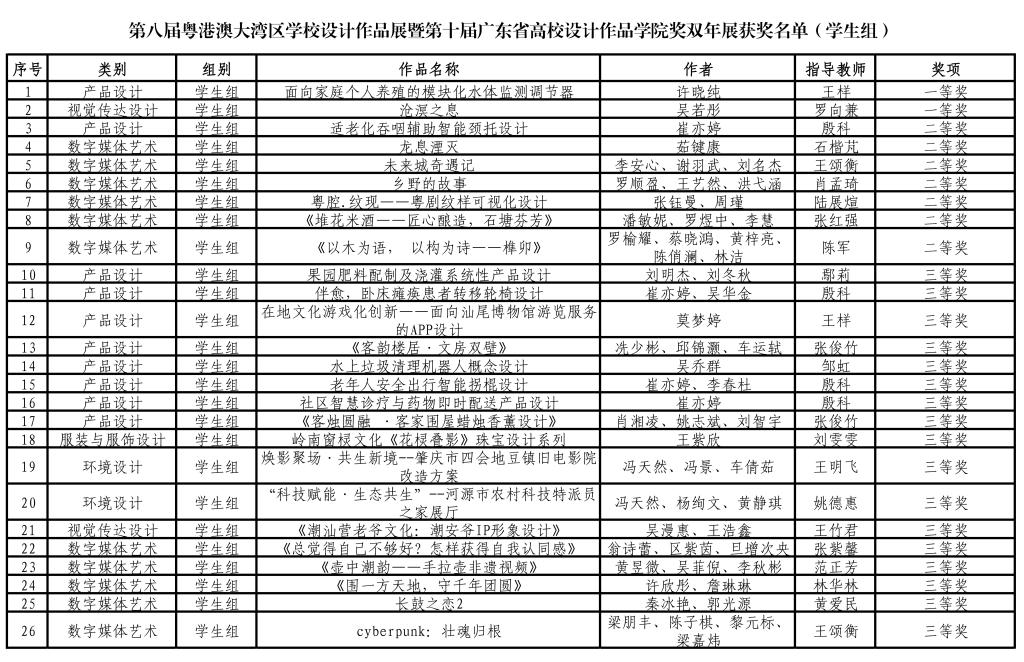 近日,第八届粤港澳大湾区学校设计作品展暨第十届广东省高校设计作品学院奖双年展评选结果揭晓。我校师生在此次展览中表现优异,共斩获41个奖项。其中,教师组荣获一等奖2项、二等奖1项、三等奖3项;学生组荣获一等奖2项、二等奖7项、三等奖17项;9位教师荣获指导教师奖,充分展现了我校师生扎实的专业素养与过硬的综合能力。