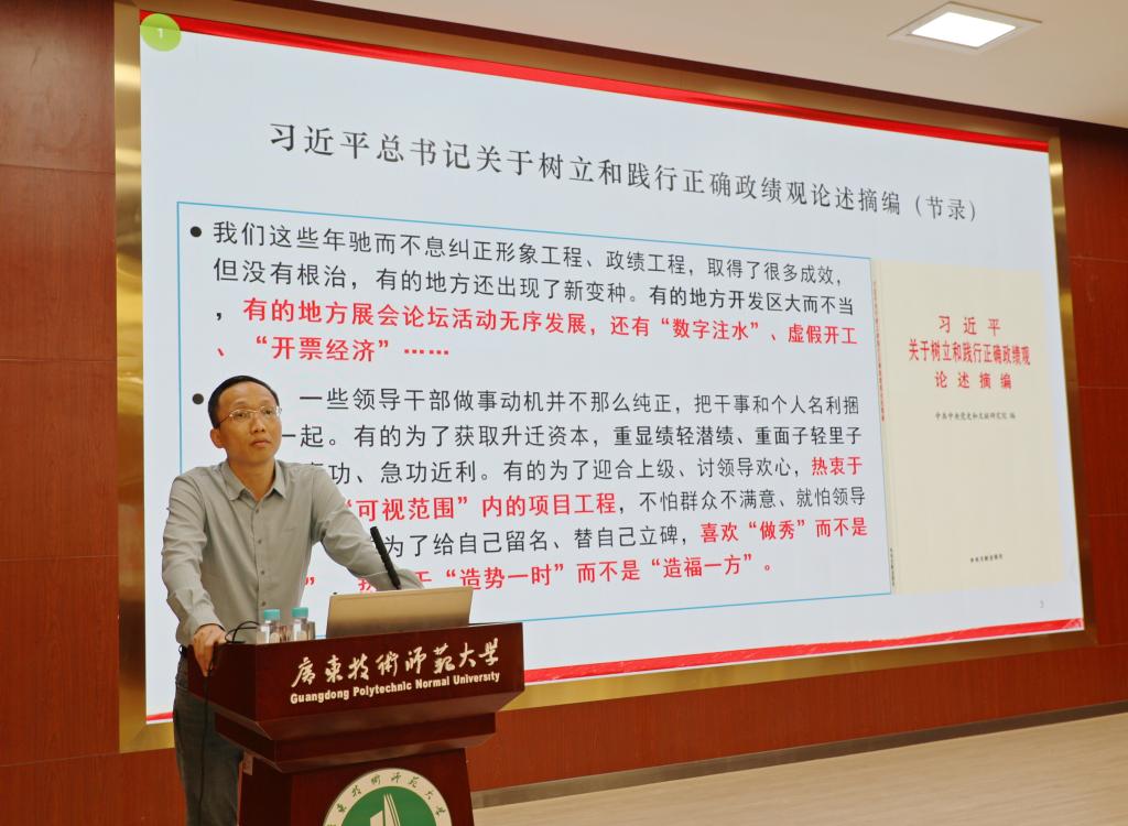为进一步深入学习贯彻习近平总书记关于树立和践行正确政绩观的重要论述、关于开展学习教育的重要指示精神,认真落实党中央决策部署和省委、省委教育工委有关要求,3月25日,学校在东校区一教208召开树立和践行正确政绩观学习教育读书班暨党委理论学习中心组学习(扩大)会,推动学校学习教育走深走实。广东省委党校党建部廖皇珠副教授受邀作学术报告。全体校领导出席会议,全体中层干部参加会议。学校党委书记王兵主持会议并讲话。