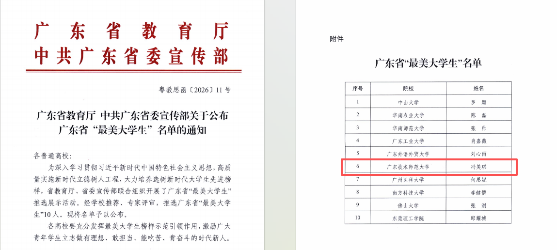 近日,广东省教育厅联合中共广东省委宣传部公布广东省“最美大学生”名单,全省仅10名大学生获此殊荣。我校计算机科学学院2023级人工智能创新实验班冯美琪同学凭借卓越的综合素质、突出的科研能力和深厚的家国情怀,从全省高校众多优秀学子中脱颖而出,荣获广东省“最美大学生”称号。
