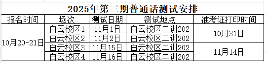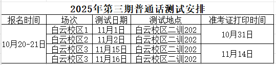 本测试站拟在10月20日至10月21日,开放2025年第三期普通话水平测试报考系统,接受考生报名,超过报名时间,不予办理报名。第三期测试按最大容量为学生提供考位,测试场次分为4场,各场次测试时间不同,地点统一在白云校区第二实训楼202普通话测试室。请考生根据自身情况选择相应场次报名。相关事项说明如下: