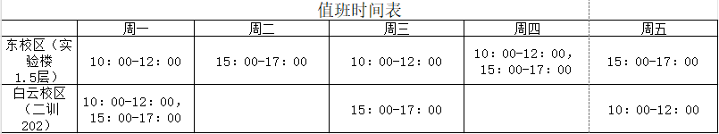本学期测试站值班时间见下表,东校区测试站值班电话:020-38265525。