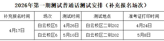 本站2026年第一期普通话测试已在3月份进行报名和缴费,根据学生报考统计情况,白云校区5和白云校区6两场测试人数较少,为了让更多考生参加普通话测试,我站计划开放上述两场测试剩余考位的报考权限,具体安排如下: