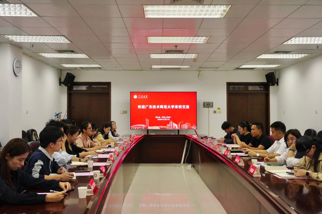 座谈会上,广州大学学生处副处长廖勇对我院一行的到访表示热烈欢迎。他简要介绍了广州大学学生工作的整体情况,并着重分享了该校在少数民族学生教育管理方面的理念与举措。广州大学少数民族学生工作办公室副主任、教育学院党委副书记蔡强详细介绍了广州大学在开展少数民族学生工作方面的具体经验、特色做法及取得的成效。